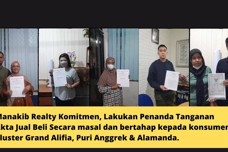 Metropolitan - Perumahan Cluster Grand Alifa, Alamanda dan Puri Anggrek adalah merupakan proyek unggulan PT Manakib Rezeki yang berlokasi di Kayu Manis, tanah sereal, kota bogor. Dalam proyeknya tersebut terdapat beberapa cluster andalan yang meliputu, cluster alamanda, cluster Grand alifia dan puri anggrek. Tepat hari ini Sabtu, 4 Juni 2022, untuk semua konsumen Manakib Realty telah melakukan menandatangani Akta Jual Beli (AJB) secara masal dan bedtahap yang di lakukan di notaris Fatimah Rista SH., M.Kn ”Alhamdulillah hari ini Semua konsumen telah melakukan penandatanganan Akta Jual Beli (AJB) secara masal dan di buat beberapa tahap di awal bulan juni ini,” tulis rilis resmi yang diterima media ini oleh PT Manakib Rezeki ( Manakib Realty ) - Dwiansyah - CRM, Sabtu (4/06/2022). Semua itu mengingat hak dan kewajiban konsumen untuk memenuhi legalitas rumah demi kenyamanan para penghuninya. Pada dasarnya setiap perumahan harus menandatangani AJB demi legalitas rumah yang dimiliki dan kejelasan status rumah yang di miliki. Namun PT Manakib Realty memang sudah membuat agenda AJB masal secara bertahap dengan sesi-sesi tertentu. “Artinya, setiap hak dan kewajiban para konsumen di Perumahan Mekar Wangi, khusunya di cluster grand alifia, alamanda dan puri anggrek, segera terealisasi dalam bulan ini dengan beberapa tahap kedepan, Sementara penandatanganan AJB akan diselenggarakan secara berkala dengan mempertimbangkan segala aspek yang ada.” Tutur Dwiansyah CRM - Manakib Realty.