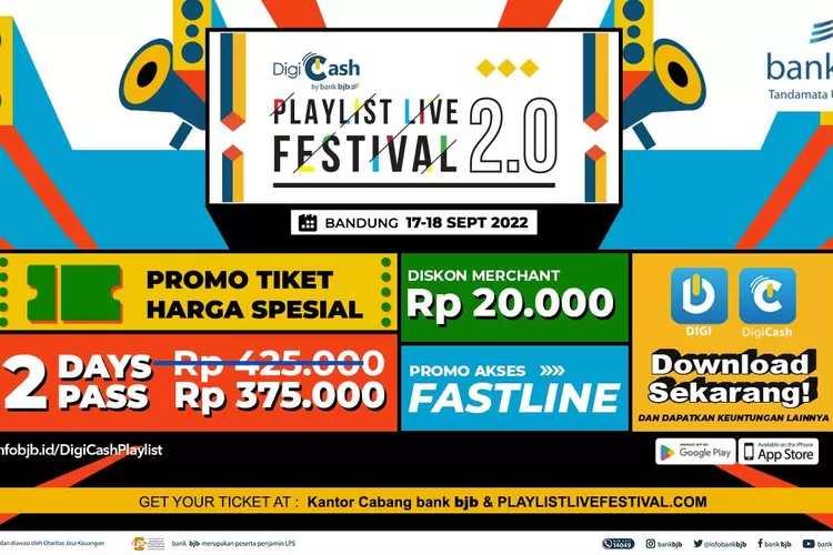 BANDUNG - bank bjb memberikan banyak kemudahan bagi nasabah penonton DigiCash Playlist Live Festival 2.0 yang menghadirkan artis-artis favorit dan terbaik di Indonesia pada era 2000-an.   Festival musik yang berlangsung selama 2 (dua) hari pada 17 dan 18 September 2022 ini berlangsung di Laswi City Heritage Jalan Sukabumi Nomor 20, Kota Bandung.   Selain dihadiri puluhan artis, sebanyak 100 tenant food & beverage siap memanjakan para penonton Digicash Playlist Live Festival 2.0.   Pemimpin Divisi Corporate Secretary bank bjb, Widi Hartoto mengatakan Digicash Playlist Live Festival 2.0 sudah sangat ditunggu-tunggu oleh masyarakat luas karena sebelumnya konser musik terpaksa berhenti selama 2 tahun akibat pandemi covid-19.   “DigiCash Playlist Live Festival 2.0 yang didukung oleh bank bjb dapat mengobati kerinduan bagi semua penonton yang hadir untuk menikmati kemeriahan acara tersebut,” ujar Widi.   bank bjb memberikan banyak keuntungan bagi nasabahnya yaitu potongan harga tiket dari harga Rp 425.000 menjadi Rp 375.000 untuk 2 Days Pass   dengan melakukan pembelian di Kantor Cabang bank bjb terdekat melalui scan QRIS menggunakan aplikasi DIGI dan DigiCash by bank bjb. Selain itu tiket juga dapat dibeli melalui website resmi dari Digicash Playlist Live Festival 2.0. di playlistlivefestival.com dengan pembayaran melalui virtual account bank bjb. Pada saat menonton konser nasabah bank bjb tidak perlu khawatir HP lowbatt karena ada fasilitas charging booth dengan melakukan donasi melalui scan QRIS sebesar Rp 13.373.   bank bjb juga memberikan promo menarik untuk setiap transaksi di tenant-tenant yang berada di area event DigiCash Playlist Live Festival 2.0 yaitu untuk minimum transaksi Rp 50.000 akan mendapatkan potongan harga sebesar Rp 20.000 dengan transaksi menggunakan DIGI dan DigiCash.   Terdapat kemudahan akses masuk melalui fasilitas Fast Line bagi nasabah yang sudah memiliki tiket dan melakukan aktivasi DigiCash by bank bjb sehingga penonton DigiCash Playlist Live Festival 2.0 bisa langsung masuk tanpa antre.   “Ayo segera download dan aktivasi DIGI dan DigiCash by bank bjb, dapatkan berbagai keuntungan dan kemudahan bertransaksi serta beragam program promo menarik,” kata Widi.