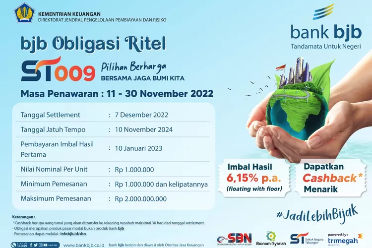 Metropolitan - bank bjb Kembali ikut memasarkan Surat Berharga Negara (SBN) Ritel Sukuk Tabungan 009 (ST009) dengan penawaran cash back yang menarik. Obligasi dengan pemesanan minimal Rp1 juta ini bisa dipesan seluruh masyarakat Indonesia dengan mudah. ST009 diterbitkan oleh pemerintah melalui Direktorat Jenderal Pengelolaan Pembiayaan dan Risiko (DJPPR) Kementerian Keuangan. Penawaran SBN ritel jenis syariah ini hanya dapat dipesan selama 20 hari sejak tanggal 11 November 2022 dan akan ditutup pada 30 November 2022 mendatang. SBN ini merupakan penawaran surat berharga negara pamungkas pada tahun ini. Tak heran, antusiasme masyarakat berinvestasi pada obligasi ritel ini cukup tinggi. Apalagi, ST009 akan dialokasikan untuk proyek ramah lingkungan di Indonesia. bank bjb, sebagai bank besar yang berlandaskan pada pembangunan daerah, juga turut andil memasarkan ST009. Banyak keuntungan yang bisa didapat untuk pemesanan melalui bank bjb. Apalagi proses pembelian obligasi ini sangat mudah. Pertama, ST009 menawarkan imbal hasil 6,15% per tahun fitur imbal hasil mengambang dengan batas minimal (floating with floor). Imbal hasil minimal (floating with floor) ini akan memberi kepastian investasi hingga jatuh tempo bagi para investor. Penawaran imbal hasil ini cukup menarik di tengah suku bunga Bank Indonesia yang terus naik, namun tidak akan lebih rendah dari batas minimal 6,15%. Kedua, pemesanan melalui bank bjb, investor akan mendapatkan cashback dalam bentuk uang tunai dengan nominal menarik. Cashback akan ditransfer ke rekening nasabah, maksimal 30 hari setelah tanggal settlement. Dua keuntungan ini akan menambah cuan yang bisa didapat investor di tengah kondisi ketidakpastian ekonomi saat ini. Apalagi, nominal pemesanan ST009 dimulai dari nominal Rp1 juta hingga Rp2 miliar atau setara 2.000 unit. Nilai cuan yang cukup besar untuk imbal hasil di atas rata-rata bunga deposito. Pembayaran bunga dan pokok SBN Ritel ST009 dijamin oleh Negara Republik Indonesia Setelah masa penawaran, tanggal settlement ditetapkan pada tanggal 7 Desember 2022 dengan pembayaran imbal hasil pertama pada 10 Januari 2023. ST009 ini akan jatuh tempo pada 10 November 2024. Untuk pemesanan melalui bank bjb, calon investor bisa mengakses link infobjb.id/sbn setelah memiliki rekening efek di bank bjb. "Keikutsertaan bank bjb menjadi Sub Mitra Distribusi SBN Ritel ST009 adalah bentuk komitmen perseroan mendukung program pemerintah, terutama dalam membiayai proyek ramah lingkungan, sebagaimana upaya kita bersama menjaga bumi," kata Pemimpin Divisi Corporate Secretary bank bjb Widi Hartoto. Diketahui, obligasi adalah surat utang yang diterbitkan oleh pemerintah atau korporasi berisi janji dari pihak yang menerbitkan untuk membayar kupon obligasi dan melunasi pokok utang pada waktu yang telah ditentukan, sesuai Undang-Undang Nomor 24 Tahun 2002. Beberapa keuntungan investasi obligasi adalah adanya imbal hasil atau return yang lebih bersaing dibandingkan dengan produk deposito. Kemudian memberikan pendapatan yang tetap berupa kupon obligasi. Namun yang terpenting adalah investasi aman dengan pengembalian pokok 100% pada saat jatuh tempo. Namun, sebagai produk negara dan bukan produk bank bjb, perseroan dalam hal ini hanya memasarkan atau agen penjual. Setiap pilihan atas produk Obligasi yang dibeli (calon) Investor merupakan tanggung jawab dan keputusan (calon) Investor sepenuhnya, termasuk apabila (calon) investor memilih jenis produk yang tidak sesuai dengan profil risiko (calon) investor.