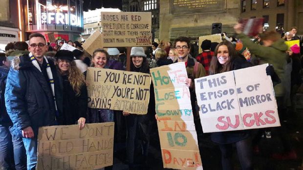 Demo terjadi di Grey's Monument City Center, Newcastle, Inggris, pada Selasa (31/1/2017) waktu setempat. Kala itu, ratusan warga membawa berbagai tulisan seperti 'Refugees are welcome here'. Trifty yang hadir di tengah-tengah mereka mengatakan cukup banyak warga Newcastle yang menolak kedatangan Trump ke Inggris.