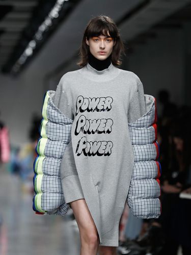 Beberapa koleksinya pun terlihat out of the box. Diperlihatkan sebuah sweater dengan lengan super mengembung yang tampaknya diisi oleh busa.