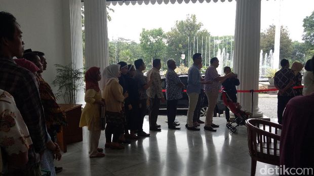 Antrean pertama, yaitu dari pintu samping pendopo hingga ke jalan masuk utama (tangga depan) di tengah pendopo diperuntukkan bagi warga yang ingin berfoto bersama Ahok. Sedangkan, antrean dari tangga jalan masuk utama menuju pintu masuk kantor gubernur diperuntukkan bagi warga yang ingin mengadu.