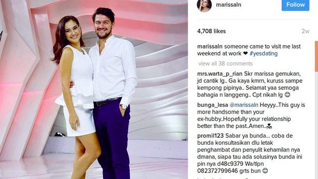 "Ya, benar, lagi bahagia, pacar baru, udah itu aja," ujar Marissa saat ditemui usai mengisi 'Rumpi No Secret' di Gedung Trans TV, Jalan Kapten Tendean, Jakarta Selatan. Foto-foto kemesraan bersama sang kekasih sudah sering dipajang melalui akun Instagram milik pribadinya. Presenter '!nsert' itu mengakui mulai menjalin hubungan dengan pria yang berasal dari Jerman itu sejak awal tahun 2017.
