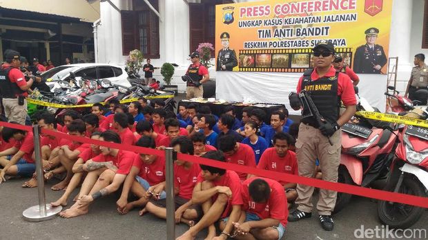 METROPOLITAN - Tim anti bandit bentukan Polrestabes Surabaya memamerkan hasil tangkapan. Di hadapan Kapolda Jatim mereka menunjukkan kinerjanya selama satu bulan atau sejak tim Anti Bandit dibentuk. "Tersangkanya ada 45 tersangka, 43 pria dan 2 perempuan. 38 Merupakan residivis, 7 orang tangkapan baru," ujar Kapolda Jatim Irjen Pol Machfud Arifin kepada wartawan di Polrestabes Surabaya.