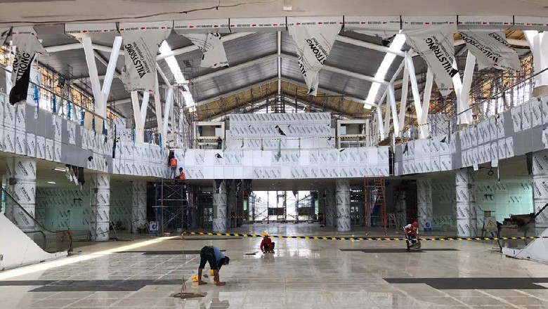 di dalamnya terdapat keramik yang sedang dipasang. Ada juga pekerjaan pemasangan eskalator.