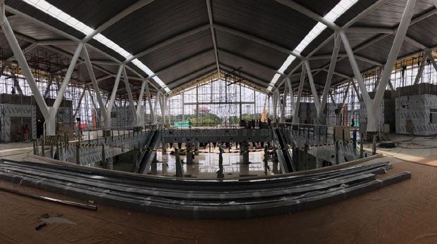 Di Bandara, pekerjaan yang sedang dilakukan adalah pembangunan stasiun. Dari luar, pembangunan stasiun kereta bandara ini tampak hampir selesai.