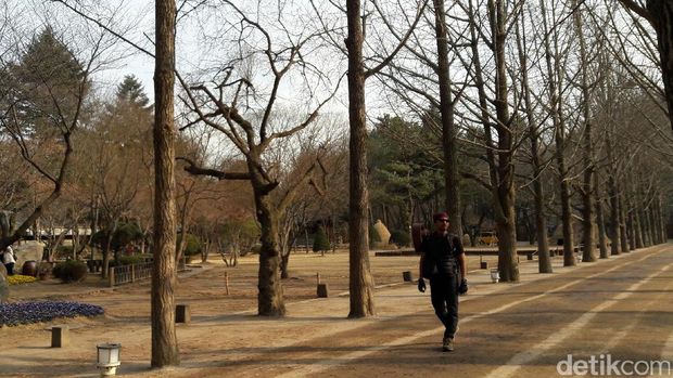 Di sana terdapat jajaran pepohonan, dari pohon pinus hingga ginkgo yang cantik. Jajaran pohon ada di kanan kiri jalan setapak. Spot inilah jadi jadi favorit buat foto-foto romantis ala Winter Sonata. Tapi memang karena kali ini sudah memasuki musim semi, jalanan itu tak lagi dilapisi salju. "Nami keren dan romantis banget ya. Jadi pengen balik lagi ke Nami di musim berbeda. Mungkin winter pas bersalju," ujar Desvriany.