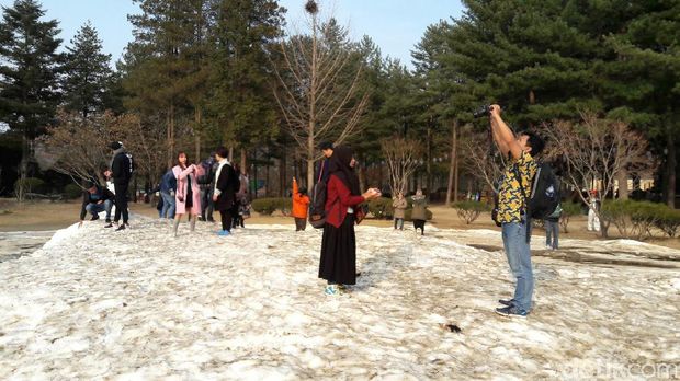 METROPOLITAN – Drama Korea Winter Sonata sempat booming beberapa tahun lalu. Lokasi syutingnya di Korea Selatan pun kini menjadi destinasi favorit turis. Nami Island, sebuah pulau buatan di Chuncheon, Korea Selatan, kian populer sejak menjadi lokasi syuting Winter Sonata pada 2002. Lokasinya 63 km dari Seoul, dan dapat dicapai dengan berkendara sekitar 1,5 jam. Kemudian dilanjut naik kapal 5 menit menuju dermaga di Nami Island. Muhammad Catur Nugraha, Renky Liniaryadi dan Desvriany Susilo, Jumat (24/3/2017) kemarin berkunjung ke Nami Island. Mereka tampak bersemangat jalan-jalan di Nami yang memberikan kesan romantis. "Ini tempatnya romantis banget," kata Renky.