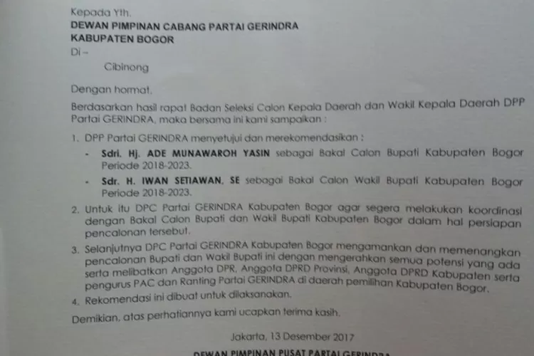 Sementara itu, Ketua DPC Partai Gerindra Kabupaten Bogor yang juga bakal calon wakil bupati Bogor 2018, Iwan Setiawan, mengaku rekomendasi partai merupakan hak prerogatif DPP. DPC hanya melaporkan perkembangan konstalasi di Kabupaten Bogor dan figur-figur potensial yang siap maju di pemilihan bupati (pilbup) Bogor 2018. “Kami sampaikan apa adanya ke DPP. Tentunya keputusan ini sudah melalui pertimbangan dan kajian DPP. Itu ranah DPP dan kami fatsun,” terang Iwan saat ditemui Metropolitan di DPC Gerindra Kabupaten Bogor, sore kemarin.