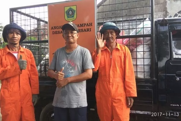 KOMPAK : Terlihat dua petugas Bank Sampah bersama Kepala Desa Bantar Sari Lukmanul Hakin (tengah) saat berfoto bersama setelah membersihkan limbah sampah..