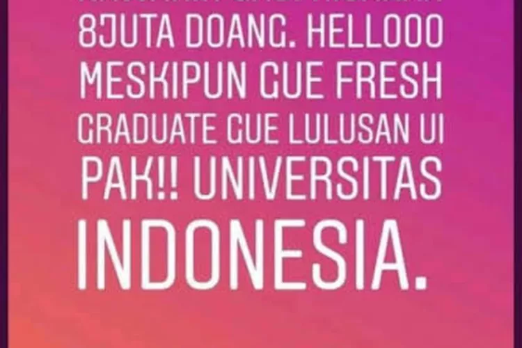 METROPOLITAN.id - Jagat dunia maya dihebohkan dengan postingan yang mengaku fresh graduate atau lulusan baru Universitas Indonesia (UI). Postingan dari Insta Story yang diunggah kembali akun Twitter @WidasSatyo itu menunjukan kekecewaan karena hanya ditawari gaji Rp8 juta usai mengikuti wawancara kerja. Belum jelas siapa identitas yang Insta Storynya diposting kembali itu. Namun tak butuh lama, postingan itu langsung viral bahkan tanda pagar (tagar) "Lulusan UI" sempat menjadi trending di Twitter. Nyatanya, viral postingan tersebut tak hanya di Twitter. Sejumlah media sosial termasuk Instagram juga ramai membahas postingan tersebut. “Jadi tadi gue diundang interview kerja perusahaan lokal dan nawarin gaji kisaran 8 juta doang. Hello meskipun gue fresh graduate gue lulusan UI, Pak. Universitas Indonesia. Jangan disamain sama fresh graduate dengan kampus lain dong ah. Level UI mah udah perusahan luar negeri. Kalau lokal mah oke aja, asal harga cocok,” demikian postingan yang viral itu. Sementara itu, Kepala Kantor Humas dan KIP UI Rifelly Dewi Astuti pun menanggapi viral postingan tersebut. Menurutnya, postingan itu merupakan bentuk ekspresi anak muda melalui media sosial. Meski demikian, ia enggan menanggapi lebih banyak lantaran identitas pemilik akun yang menulis postingan itu belum diketahui dan belum dipastikan apakah benar lulusan UI. "Kalau ditanya tanggapannya kami juga tidak bisa banyak berpendapat. Pertama identitas tidak ketauan, bisa jadi bukan alumni kami?" kata Rifelly, Kamis (25/7). Akan tetapi, jika postingan itu benar adanya dari Alumni UI, ia pun menyayangkannya. Rifelly juga berharap masyarakat tidak langsung memberi cap negatif terhadap seluruh lulusan UI akibat postingan itu. "Ya kalaupun benar itu alumni kami, sangat tidak bijak kalau kita langsung menggeneralisir pendapat dia tersebut sebagai pendapat seluruh lulusan UI," tandasnya. (kmp/fin)