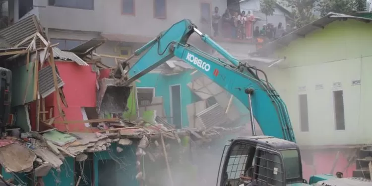 Alat berat membongkar bangunan di Kampung Naringgul, Desa Tugu Utara, Kecamatan Cisarua, Kabupaten Bogor, Kamis (29/8). (Foto: Sandika/Metropolitan)