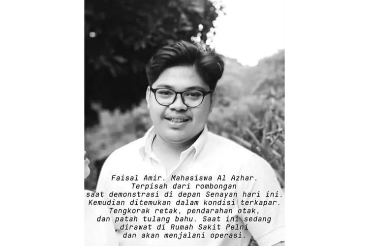 METROPOLITAN.id – Kabar tewasnya mahasiswa Al Azhar Faisal Amir beredar melalui pesan berantai di media sosial. Namun, kabar tersebut bisa dipastikan hoaks atau berita bohong. Saat ini, Faisal yang menjadi salah satu korban tindak kekerasan saat aksi di depan gedung DPR RI, Selasa (24/9) sedang dalam tahap pemulihan usai operasi. Kabar soal kondisi terkini Faisal dipastikan lewat keterangan resmi Universitas Al Azhar Indonesia (UAI). Rektor UAI Asep Saefuddin melalui keterangan resminya menuliskan kondisi terakhir Faisal Amir. Dirinya menyebut bahwa Faisal dalam kondisi stabil usai menjalani penanganan medis oleh tim dokter di RS Pelni, Jakarta. "Bahwa saat ini Faisal Amir sedang dalam kondisi stabil setelah mendapat penanganan medis secara maksimal di RS Pelni," tulis Asep dalam keterangan tertulis, Rabu (25/9). Sebelumnya, Direktur Rumah Sakit Pelni dr Dewi Fankhuningdyah mengaku Faisal masih menjalani perawatan intensif di RS Pelni. Menurutnya, Faisal masih berada di ruang ICU usai menjalani operasi dan terus dalam penanganan tim dokter. "Kondisinya masih dalam perawatan memang keadaannya masih dalam memerlukan perawatan yang intensif, masih di ICU dan pasiennya memang tengah post operasi semalam," kata Dewi, Rabu (25/9). (sua/fin)