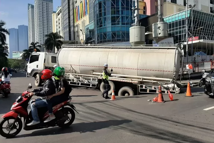 METROPOLITAN - Satu unit truk tangki terjeblos di putaran depan Mal Thamrin City. Sebagian jalan pun tertutup oleh badan truk yang tak bisa bergerak. Pantauan di depan Thamrin City, Jalan Kebon Kacang Raya, Jakarta Pusat, pukul 08.45 WIB, Rabu (18/12/2019), tampak roda bagian belakang truk tersebut terjeblos ke rongga gorong-gorong yang ada di bagian bawah jalan. Ban bagian belakang truk tersebut tersangkut ke jalan yang ambruk. Kejadian itu disebut terjadi sejak pukul 01.00 WIB dini hari. Belum ada informasi terkait dugaan penyebab bagian jalan tersebut ambruk. Petugas masih menunggu alat untuk mengevakuasi truk tersebut. Lalu lintas di Jalan Kebon Kacang Raya tampak lancar. Petugas dari Kepolisian dan Dinas Perhubungan berada di lokasi untuk mengatur lalu lintas.