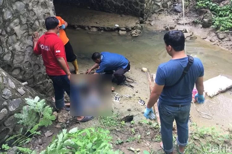 METROPOLITAN - Mayat anak laki-laki ditemukan warga di bawah jembatan perbatasan Kecamatan Kemlagi dan Dawarblandong, Kabupaten Mojokerto. Polisi menemukan sejumlah barang saat melakukan olah tempat kejadian perkara (TKP). Proses olah TKP melibatkan Tim Identifikasi dari Polres Mojokerto Kota. Kapolsek Kemlagi AKP Supriadi dan Kapolsek Dawarblandong AKP Made terlihat di lokasi. Karena sungai tempat penemuan mayat di perbatasan antara Desa/Kecamatan Kemlagi dengan Desa Cendoro, Kecamatan Dawarblandong. Mayat anak laki-laki ini ditemukan tengkurap di lumpur dasar sungai. Jaraknya sekitar 5 meter dari permukaan jalan. Korban masih memakai baju koko warna gelap dan celana pendek motif polkadot warna abu-abu tua. Separuh kepalanya terbenam di lumpur. Saat di balik tubuhnya, terdapat bercak darah di pelipis kiri korban. Tubuh anak laki-laki ini sudah kaku meski belum membusuk. Kapolsek Kemlagi AKP Supriadi mengatakan, pihaknya menemukan sejumlah barang di lokasi penemuan mayat. Salah satunya sandal jepit yang tersangkut di pipa di atas sungai. Sandal ini terikat dengan tali rafia warna merah muda. Ia menjelaskan, sampai saat ini identitas anak laki-laki yang diperkirakan berusia 12-13 tahun ini belum diketahui. Penyeban kematian korban juga masih ditelusuri. "Sementara temuan hanya sandal tergantung di pipa, bungkusan sampah, tali rafia juga ikut tergantung. Masih kami teliti," kata Supriadi kepada wartawan di lokasi penemuan mayat, Kamis (30/1/2020). "Jenazah kami bawa ke RSUD RA Basuni untuk identifikasi dan autopsi," terang Supriadi. Mayat anak laki-laki ini pertama kali ditemukan warga yang sedang melintas pagi tadi sekitar pukul 06.00 WIB. Penemuan mayat membuat warga yang penasaran berdatangan ke lokasi.