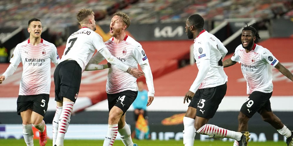 Selebrasi Simon Kjaer bersama pemain AC Milan usai bobol gawang MU di menit ke 90+2 di leg 1 babak 16 besar Liga Europa 2020-2021. © AP Photo
