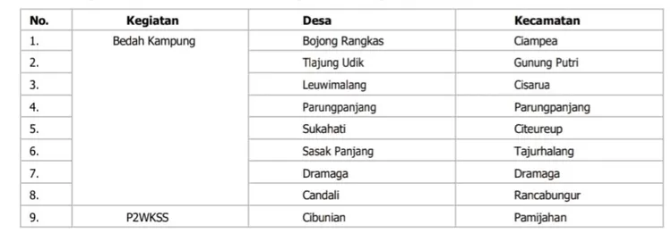 Melalui RP3KP, diharapkan Kabupaten Bogor dapat melaksanakan penanganan kawasan kumuh atau Kegiatan Peningkatan Kualitas Kawasan Permukiman Kumuh dengan Luas di Bawah 10 (sepuluh) Ha, Sub Kegiatan Pelaksanaan Peremajaan Kawasan Permukiman Kumuh (Sub Sub Kegiatan Bedah Kampung dan P2WKSS), dengan rincian lokasi sasaran kegiatan sebagai berikut :