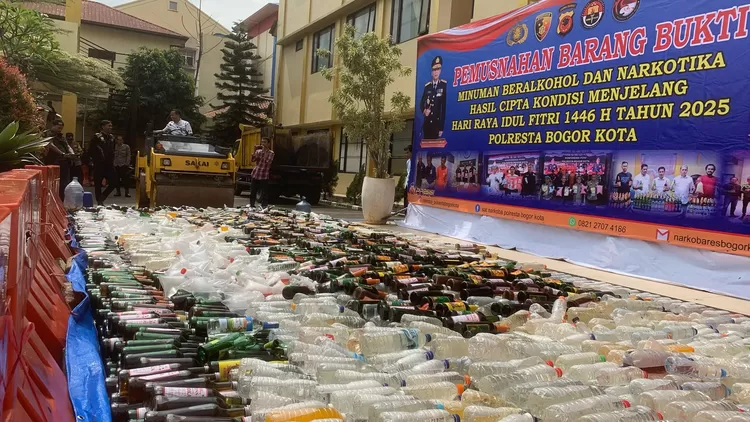METROPOLITAN.ID - Satnarkoba Polresta Bogor Kota melakukan pemusnahan barang bukti minuman keras (miras) dan narkoba jenis sabu di halaman kantornya yang berada di Jalan Kapten Muslihat, Kecamatan Bogor Tengah pada Jumat, 21 Maret 2025.