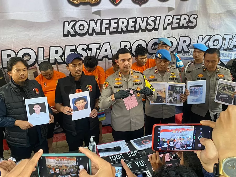 Polresta Bogor Kota merilis hasil pengungkapan kasus pencurian mobil dengan mengamankan empat tersangka di Polresta Bogor Kota, Jalan Kapten Muslihat, Kota Bogor, Kamis 16 Mei 2024.