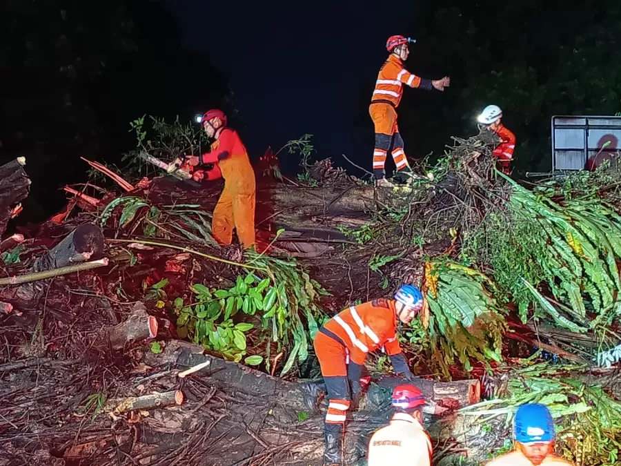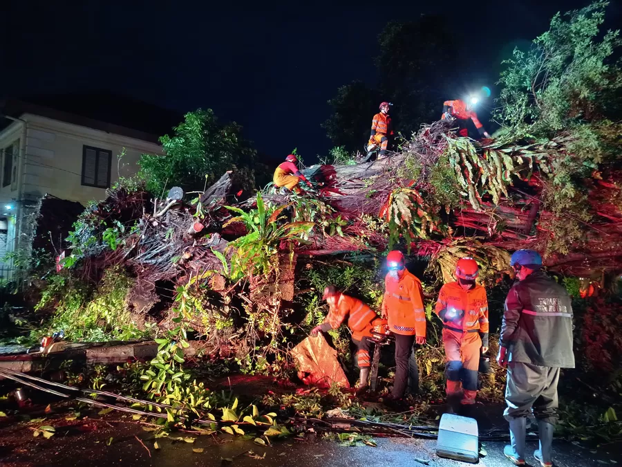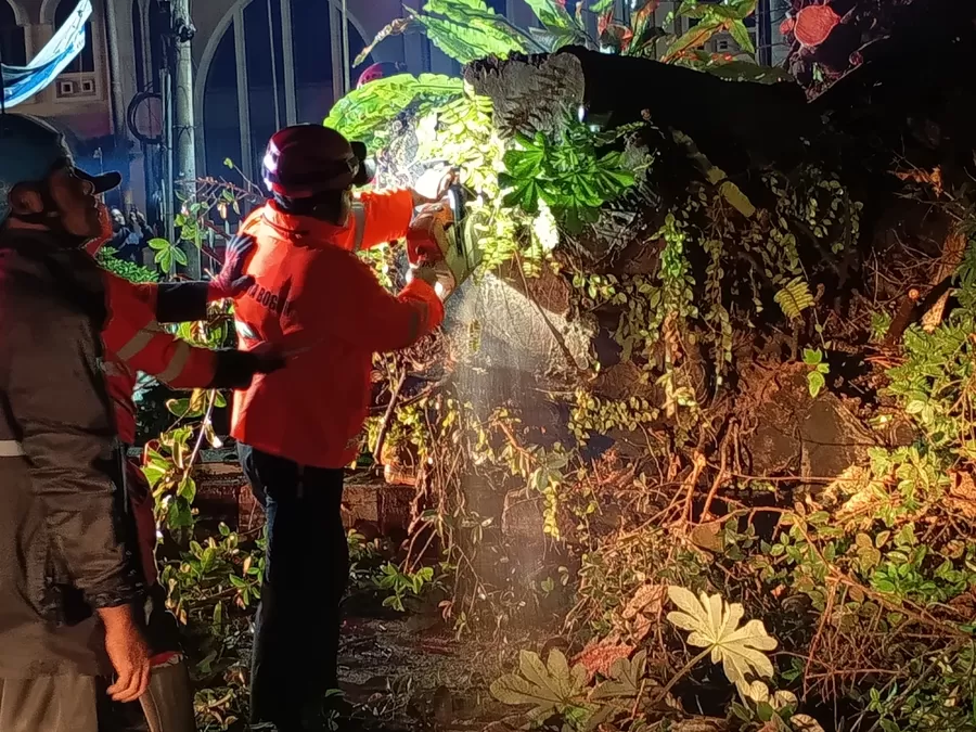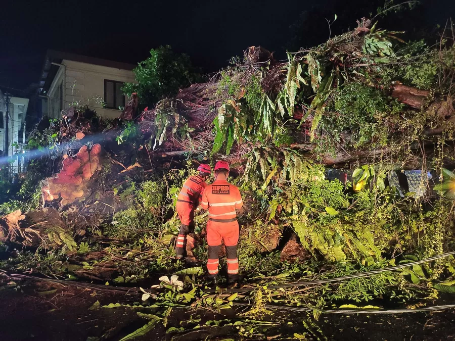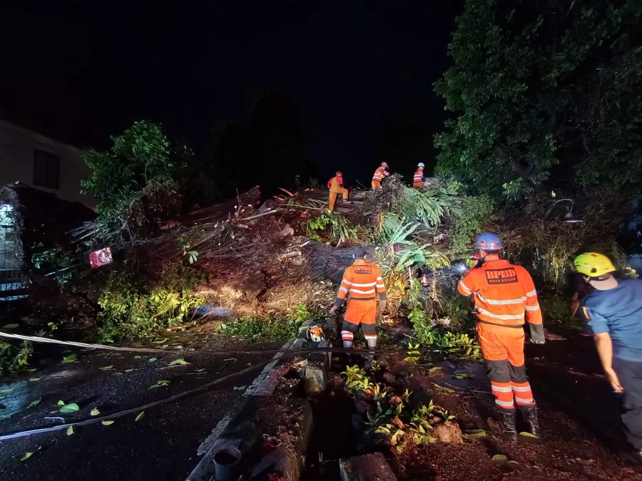 Berikut penampakan pohon tumbang beserta proses evakuasi berupa pemotongan pohon yang dilakukan petugas gabungan dari Pemkot Bogor. (Reza Metropolitan)