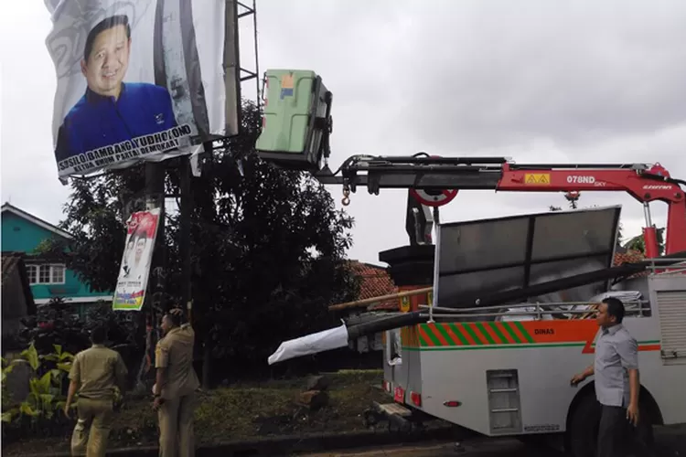 METROPOLITAN - Dinas Perumahan, Kawasan Pemukiman dan Pertanahan (DPKPP) Kabupaten Bogor akhirnya mencopot sejumlah spanduk, dan baliho partai politik (palpol) yang berada  di sepanjang Jalan Protokol Tegar Beriman dan Pakansari.