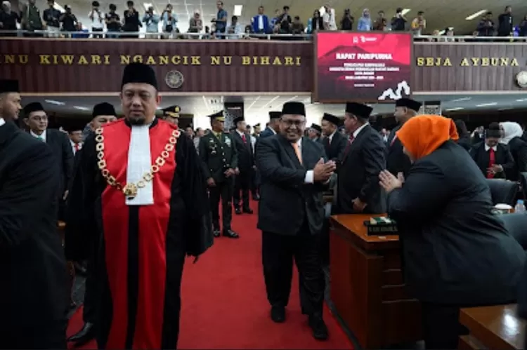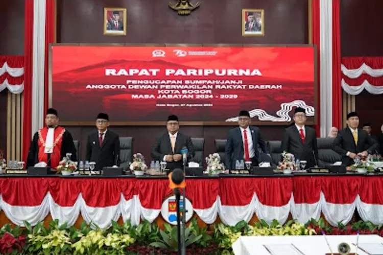 METROPOLITAN.ID - Pelantikan 50 anggota DPRD Kota Bogor periode 2024 - 2029 berlangsung secara khidmat di ruang paripurna, gedung DPRD Kota Bogor, Selasa (27/8/2024). Pengambilan sumpah jabatan dan penyematan pin DPRD Kota Bogor, disaksikan secara langsung oleh unsur Forkopimda Kota Bogor dan masyarakat yang hadir pada rapat paripurna istimewa tersebut.