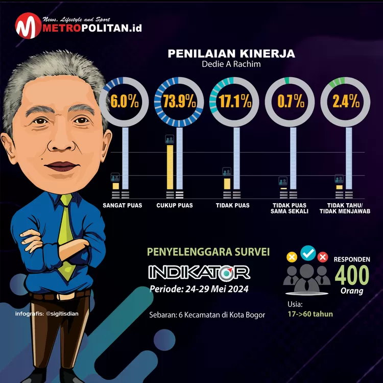 Berikut rincian penilaian publik terhadap kinerja Dedie A Rachim berdasarkan hasil survei Indikator. Sebanyak 6 persen responden menyatakan sangat puas. Lalu, sebanyak 73,9 persen cukup puas.